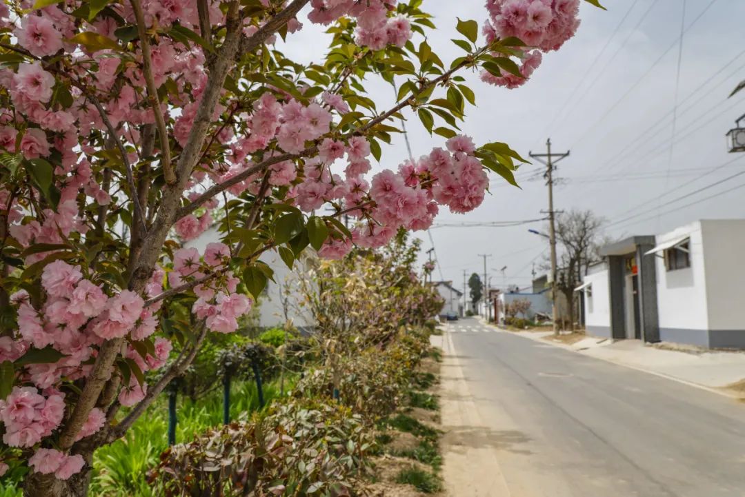 春日粉嫩樱花与整洁村舍相映成趣,美丽乡村尽显蓬勃生机。
