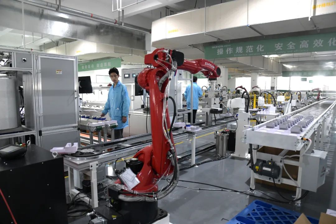 技术工人在生产线上操作机器人生产加工产品。