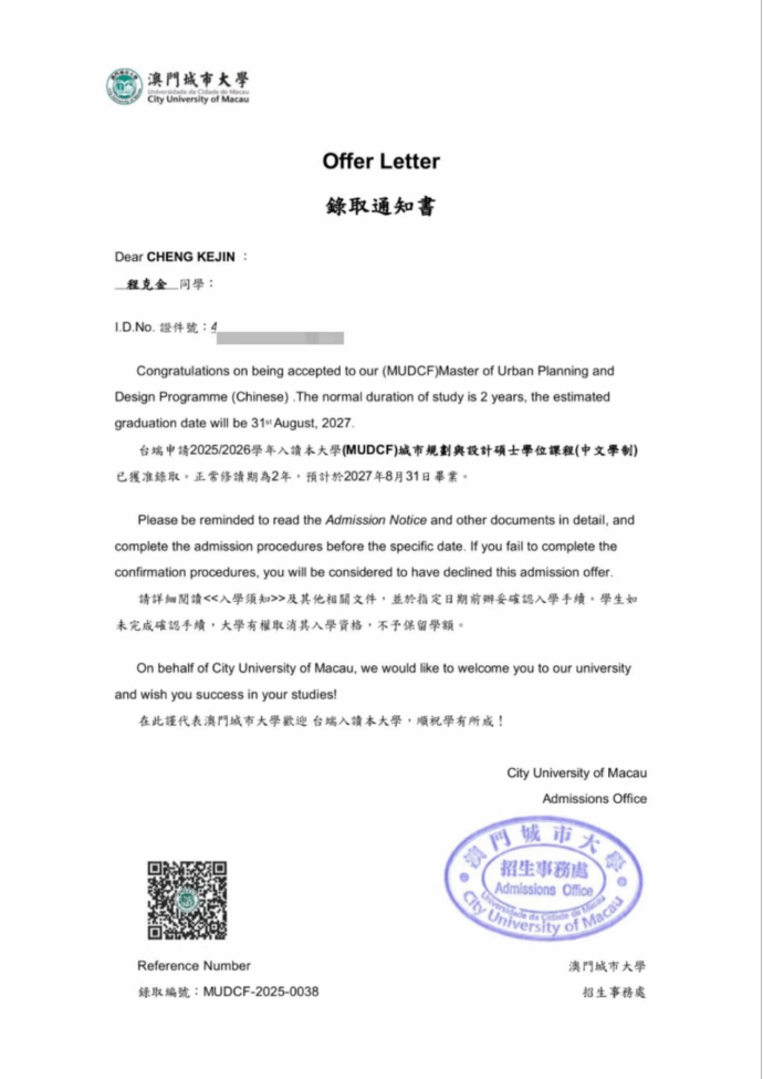 据了解,湖北工业大学土木建筑与环境学院建筑学专业,是湖北省高校中唯一通过全国高等学校建筑学专业本科教育评估的专业,为国家级一流本科专业建设点,并拥有湖北省名师工作室和优秀教学团队,学科实力强劲。与此同时,澳门城市大学城市规划与设计硕士点,作为澳门地区唯一一个以城市为研究对象,涵盖城市规划与管理以及城市设计方向的专业硕士点,对申请者的专业素养和综合能力要求颇高。程克金能够脱颖而出,足见其扎实的专业知识和优秀的综合素养。