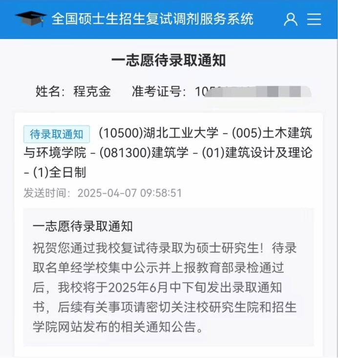 近日,武昌理工学院智能建造学院建筑学专业2101班学生程克金凭借优异的成绩和突出的综合素质,同时被湖北工业大学建筑学专业和澳门城市大学城市规划与设计专业录取为硕士研究生。