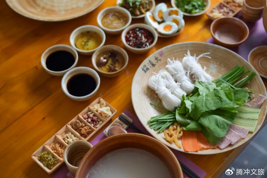 大滚锅饵丝以腾冲优质饵丝为主料,配土鸡、老鸭等熬制的高汤及多种时蔬。陶碗高温加热盛沸汤,食材入碗焖熟,饵丝软糯,汤汁鲜香。