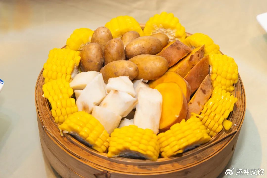 火山灰蒸制的山药、玉米、芋头、红薯,保留食材本味,蘸上云南单山蘸水,粗粮的质朴与热泉的矿物气息交织,一口尝尽山野清甜。