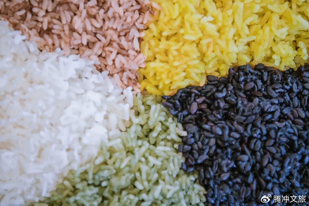 红、绿、黄、紫、白五种颜色的粗粮,在热泉蒸汽中舒展成晶莹饭团。红米的热烈、白米的清新相互交织,搭配天然花草染色的诗意美学,既满足视觉享受,又富含膳食纤维,低卡又健康。