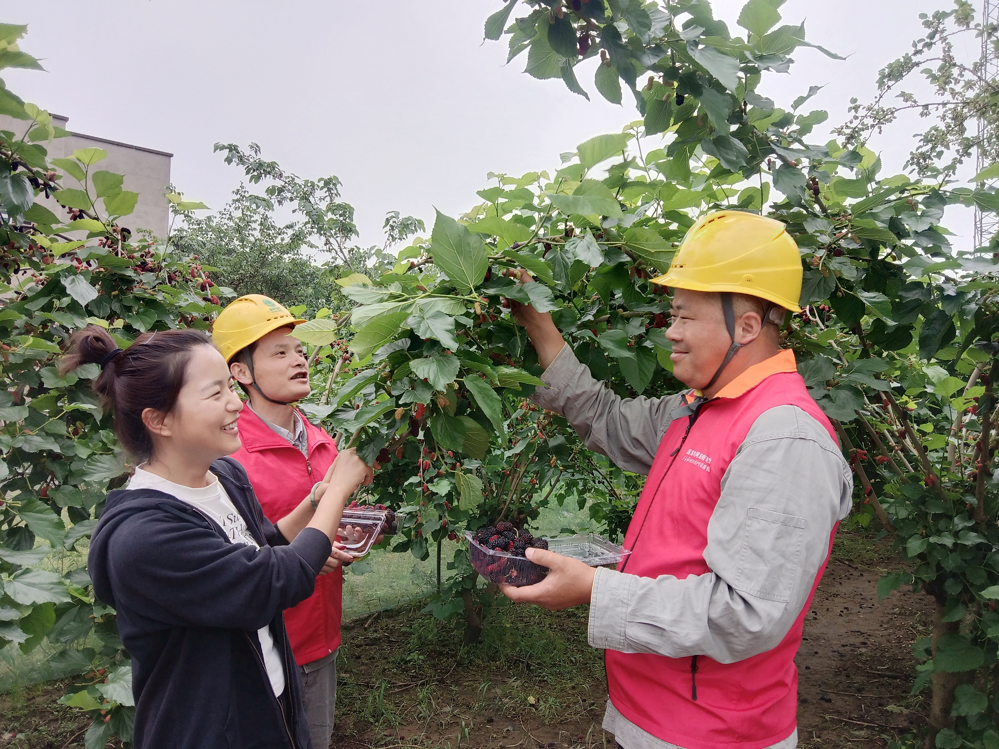 我们似乎被道路两旁农户的招呼和问候裹挟着往前走,温度比初夏的阳光还要热烈。洲中右手边第一家是杨湘军家,他和媳妇摆好桌椅拉我们到院子里,指着自家房子一二楼衔接处淡黄的水印说是水淹的位置,说黄灯为避开汛期涨水,贴心地将电表装在二楼,自己每次用套脚扣爬上去维护。洲尾左手边一块出产紫色、奶油色以及长条形三个品种桑葚的地里,主人曹大姐说每次洪水来都搭帮黄灯帮忙搬冰箱、电视上二楼,然后再三再四地喊我们进桑林采摘品尝,还递来盒子说不摘满不出林。洲头方向莲池边上有成片桑叶随风而动,好些桑农和黄灯一路聊起表计运转和用电需求,当然也会聊起桑葚季后就要忙着养蚕抽丝了。