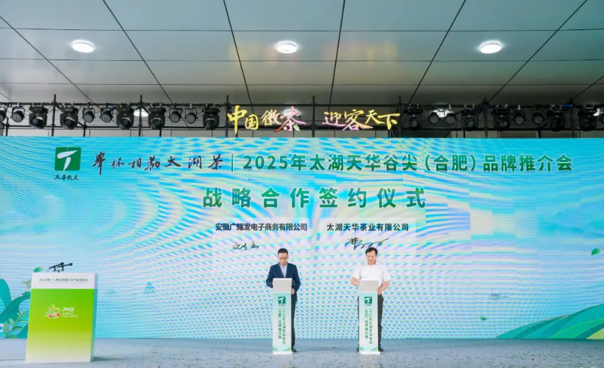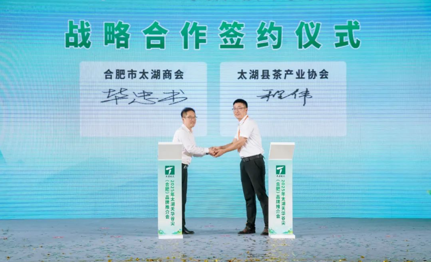 活动现场,茶艺师以《一叶千年·天华谷尖》为主题,呈现了一场极具韵味的表演。在天华谷尖产品展示后,太湖县茶产业协会、太湖天华茶业有限公司分别与合肥市太湖商会、安徽广耀发电子商务有限公司签署战略合作协议。