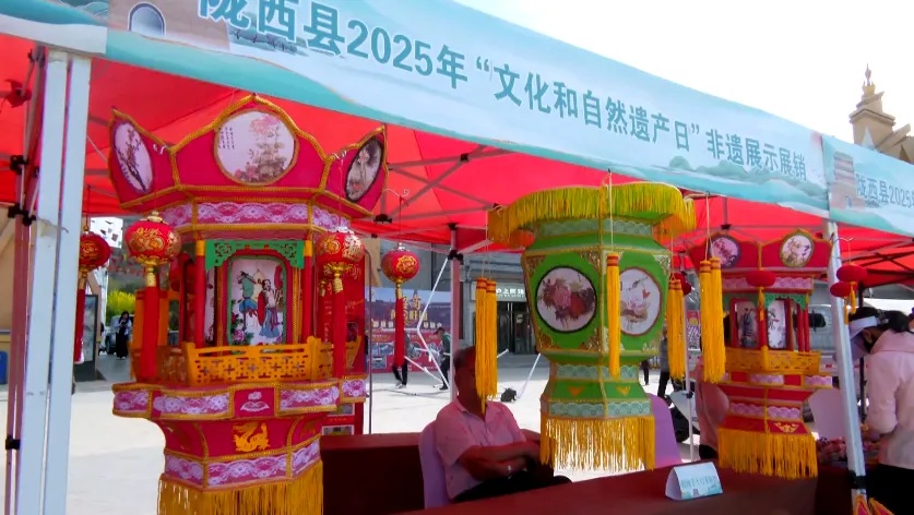陇西县文化馆非遗办公室主任 崔树声:我馆参与非遗展示展销的有40多家,主要有省级非物质文化遗产、靛坪大曲酿酒技艺,还有陇西腊肉制作。其中本次要申报的咱们陇西制鼓、三弦二弦制作比较新颖,吸引了众多游客的喜爱。咱们这次展示展销活动比以往的门类多,种类齐全。