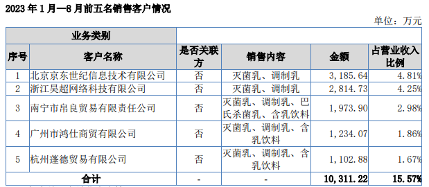 重押电商平台,为百菲乳业带来了可观收入。2021、2022年、2023年前8月,京东、天猫这两家头部电商平台,均位列百菲乳业的前五大客户。2023年前8月,京东、天猫就为其贡献了约6000万元收入,在总营收的占比接近一成。