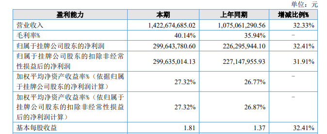 去年,百菲乳业依然保持了增长态势。据其年报,2024年,百菲乳业的毛利率进一步增至40.14%,实现营业收入14.23亿元,同比增长32.33%;归属于挂牌公司股东的净利润为3.00亿元,同比增长32.41%。与2021年相比,营收规模、净利润都近乎翻倍。