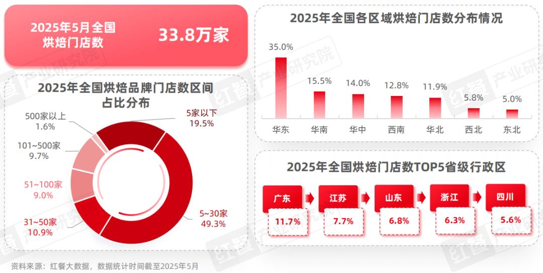 在门店数和区域分布方面,据红餐大数据,截至2025年5月,全国烘焙门店数达到33.8万家。其中,华东区域门店数占比最高,达到35.0%;其次是华南、华中、西南、华北区域,门店数占比均超过10%。具体到省级行政区来看,广东省的烘焙门店数占比最高,达到11.7%,其与江苏省、山东省、浙江省及四川省组成烘焙门店数TOP5省级行政区。