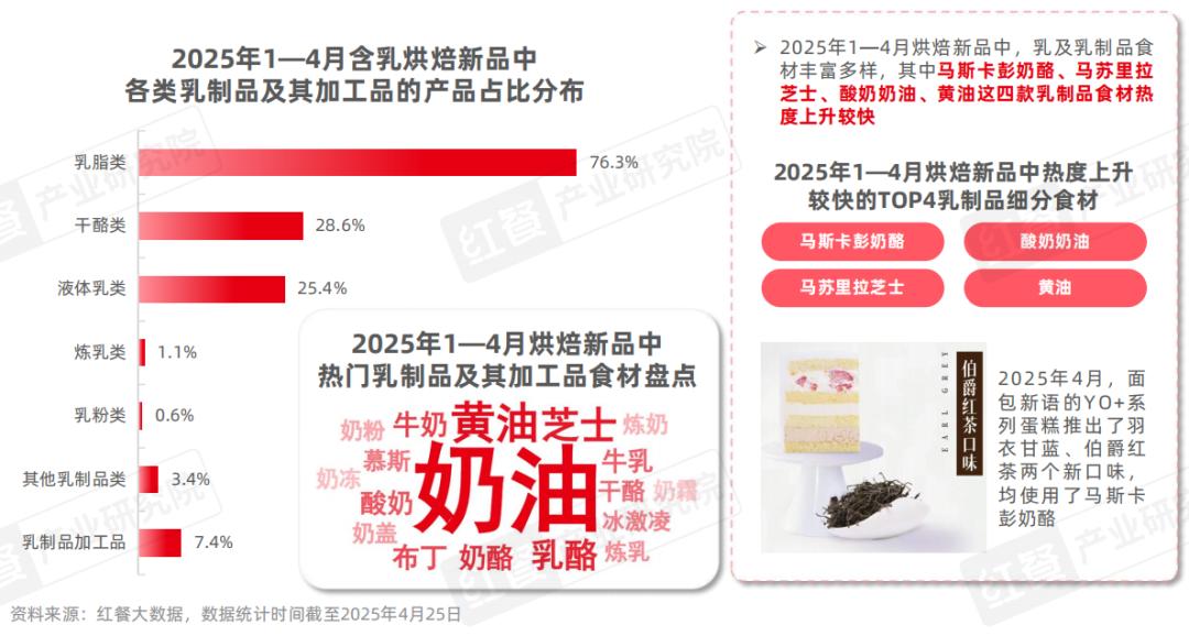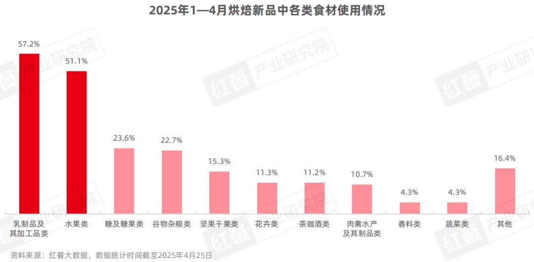 从食材应用来看,据红餐大数据,2025年1—4月烘焙样本品牌的新品中,使用乳及乳制品类、水果类食材的新品数量相对较高,占比分别达到57.2%和51.1%。