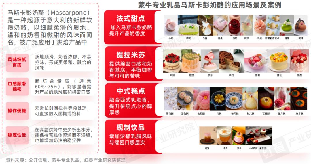 以蒙牛专业乳品新推出的马斯卡彭奶酪为例,品牌通过自主研发实现马斯卡彭奶酪的国产化,并积极拓展其多元应用方向。在2025年第27届中国国际烘焙展上,蒙牛专业乳品展示了多款含马斯卡彭奶酪的烘焙新品,涵盖法式甜品、提拉米苏蛋糕、中式糕点、现制饮品四大应用场景,这些新品通过融入马斯卡彭奶酪进一步丰富了产品的奶香层次与顺滑口感。