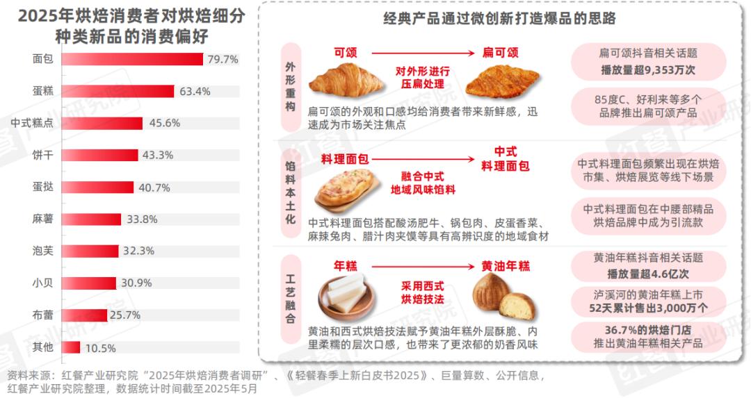 在经典产品热度不减的基础上,品牌通过“微创新”持续推陈出新,近年来相继诞生了多个爆品。如扁可颂通过外观创新在社交媒体上引发热议,中式料理面包结合本土食材打造差异化口感记忆,黄油年糕则在工艺上“中西结合”,成为2025年第一季度的现象级爆品。