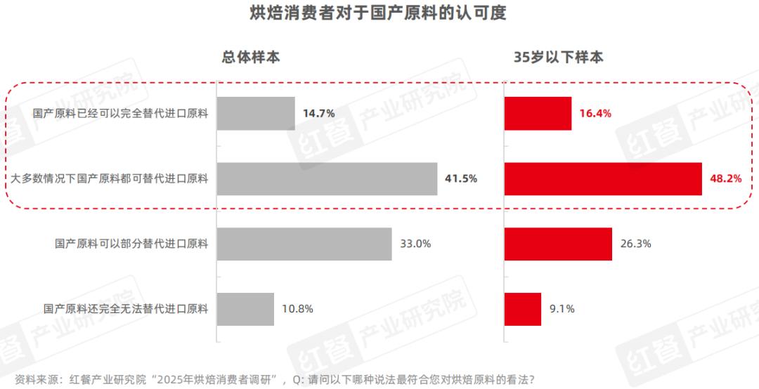 此外,仅有10.8%(整体样本)与9.1%(35岁以下)的烘焙消费者认为国产原料“完全无法替代”进口原料。这一人群比例相对较低,反映出“唯进口论”的观念在烘焙消费中正在被逐步打破。