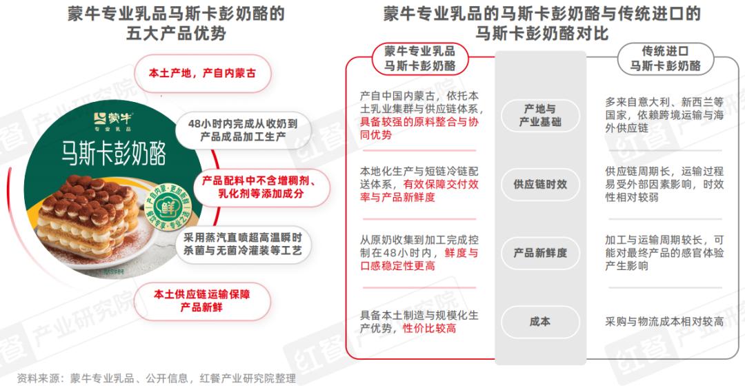 以蒙牛专业乳品推出的马斯卡彭奶酪为例,其作为国产高端未成熟干酪的代表产品,具有五大核心优势,不仅在成分层面契合“清洁标签”趋势,在应用层面亦能显著提升烘焙产品的奶香风味与顺滑口感,兼顾新鲜度与稳定性,为本土烘焙品牌打造差异化出品提供了可靠的国产解决方案。