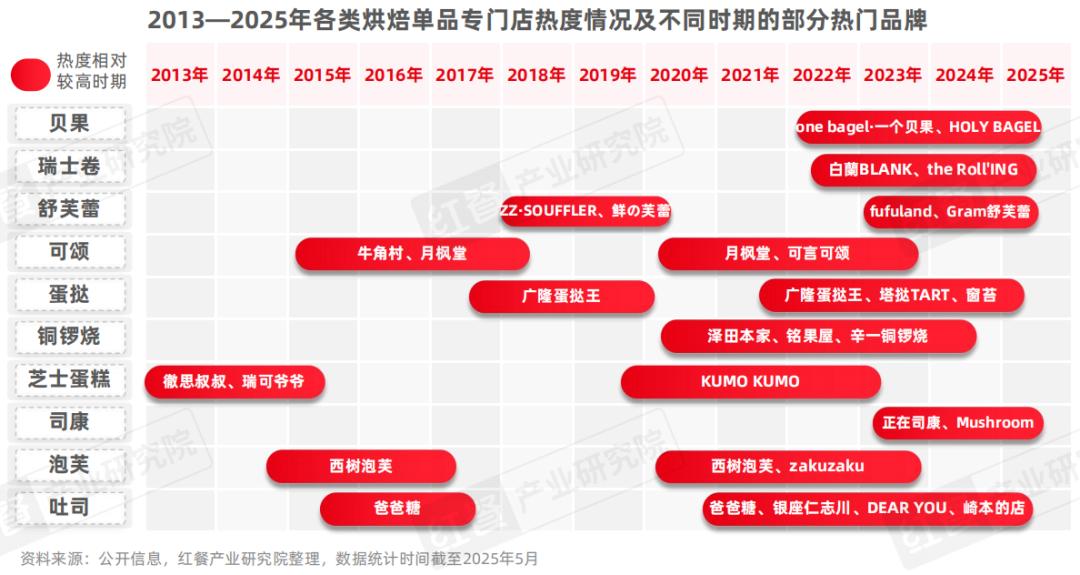 据红餐产业研究院不完全统计,2013年至2025年5月,烘焙单品专门店呈现“接力式走红”态势,从早期的芝士蛋糕、泡芙、吐司、可颂,到后续兴起的蛋挞、舒芙蕾、铜锣烧,再到近三年热度迅猛上升的贝果、瑞士卷与司康,越来越多的细分产品被挖掘。总体来看,不同细分单品专门店均涌现出多个品牌,但有的烘焙单品专门店因产品力、运营能力、供应链等方面的不足,已逐渐淡出市场。