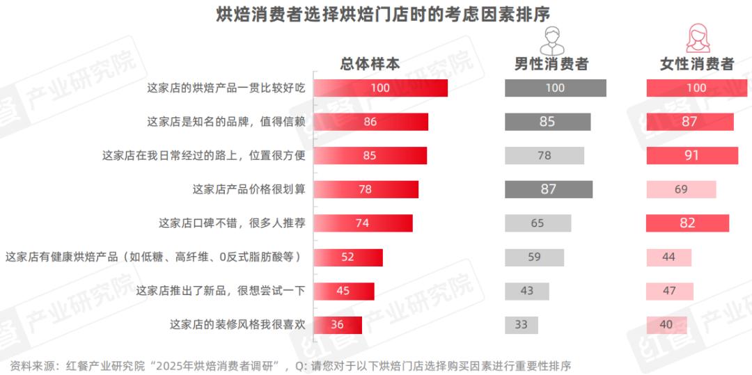 此外,不同性别消费者的偏好有一定的差异性。男性烘焙消费者对价格的重视程度仅次于口味,但女性对于口碑、位置和品牌的重视程度则明显更高。