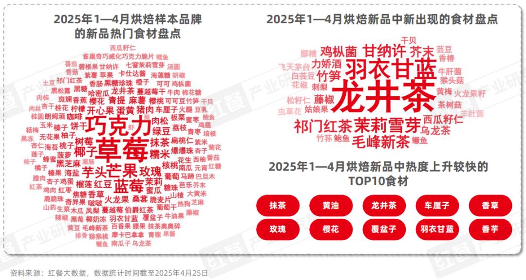 具体来看,草莓、巧克力、蓝莓、芒果等食材出现在众多新品中,其中,抹茶、黄油、龙井茶、羽衣甘蓝等食材热度上升较快。此外,与去年同期相比,2025年1—4月烘焙样本品牌新品中,出现了樱花、羽衣甘蓝、鸡枞菌、醪糟、茶树菇等食材。