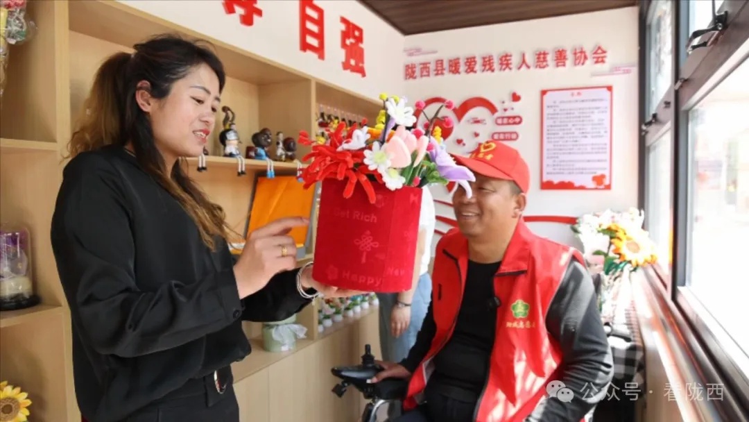 今年,陇西县残联继续深化 “爱心助残”就业行动,争取省级财政资金10万元,依托爱心民企在巩昌镇广场丽苑门口打造了21 平方米“爱心屋”助残平台,集就业帮扶、技能展示、产品销售于一体,带动至少2名重度残疾人就业。在爱心屋就业的残疾人汪爱军告诉记者,他每天上半天班,负责售卖手工艺品,既增加了收入,也让生活更有奔头了。