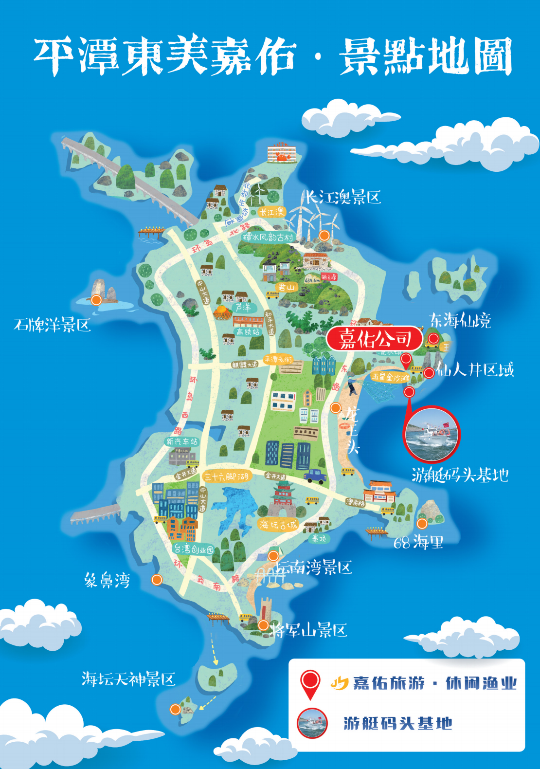 平潭东美嘉佑休闲渔业基地坐落于东美村的东海仙境。基地借助东海仙境“仙人井”景区独特的秀美风光,与村内多个民宿、餐饮店开展合作运营,也是平潭综合实验区嘉佑渔业开发有限公司在文旅板块的进一步拓展。