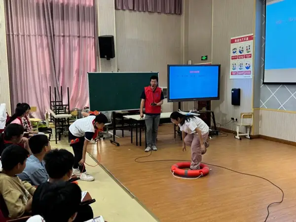 活动现场,市委平安办工作人员薛永副化身“安全讲师”,通过播放防溺水警示教育片、展示真实案例图片,直观呈现溺水事故的惨痛后果。在互动环节,学生们踊跃参与“溺水场景模拟”,亲身体验错误施救导致的危险境遇。“安全讲师”薛永副现场演示了“叫-打-伸-抛”四步救援法,并邀请学生操作救生圈、长杆等救援工具,手把手纠正动作要领。“原来溺水时不能盲目下水救人,要立即呼救并寻找漂浮物!”六年级学生李明在体验后深有感触地说。