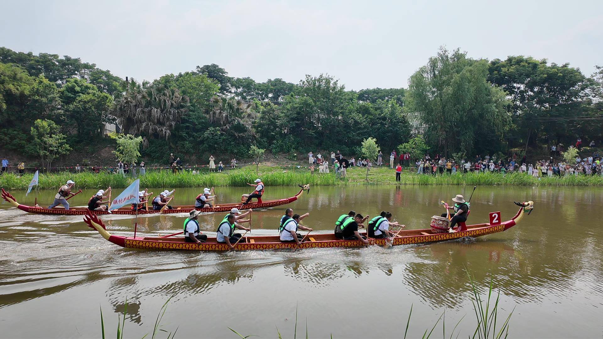 当天上午,在激昂有力的鼓点节奏中,运动员们整齐划一奋力挥桨击水,龙舟如离弦之箭在湖面上飞驰,各支队伍你追我赶,岸上观众的呐喊助威声此起彼伏,现场气氛热烈非凡。