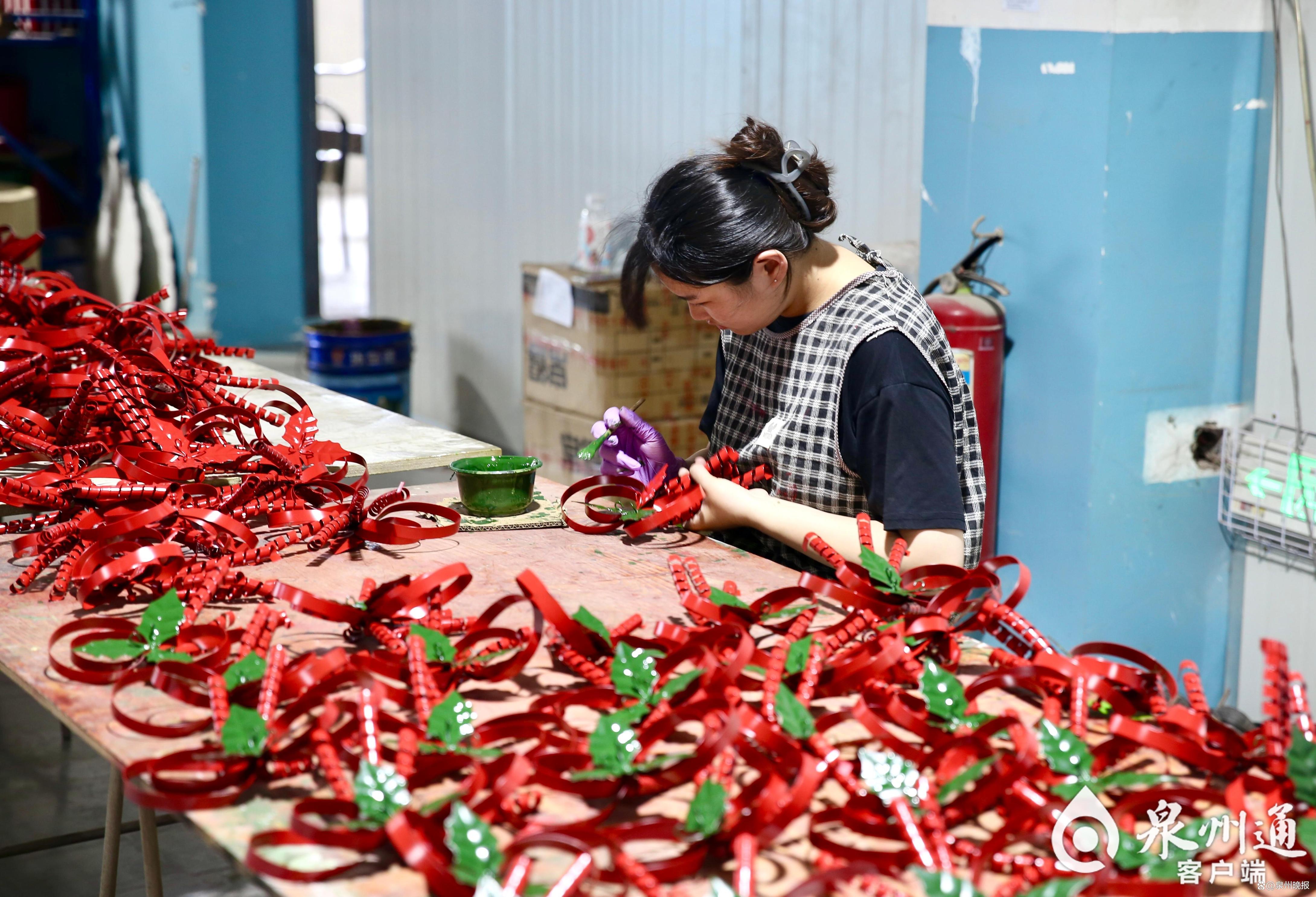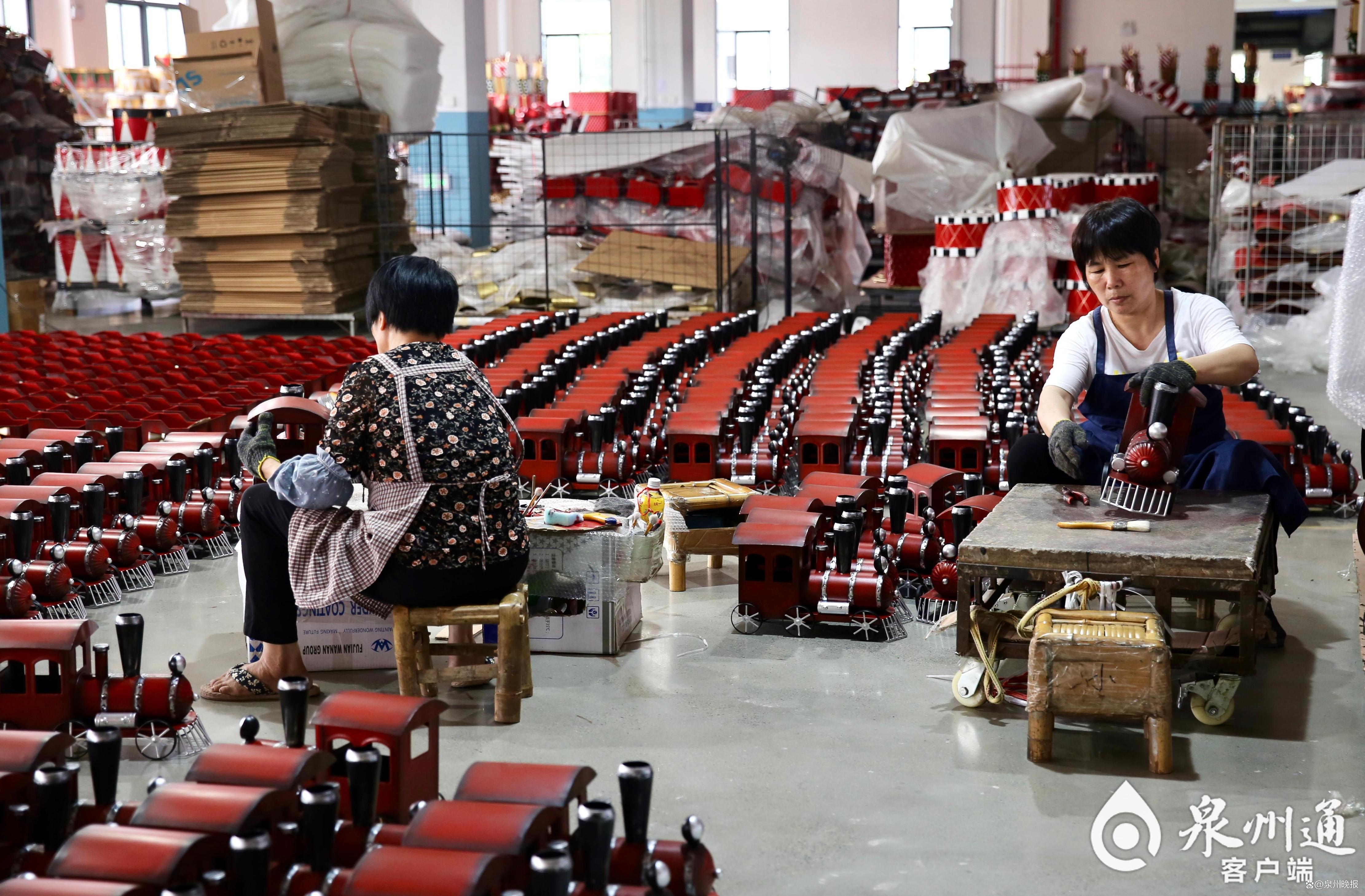 福建安溪佳福工艺品有限公司车间内,正紧锣密鼓地加紧圣诞出口订单生产。(林书修 摄)