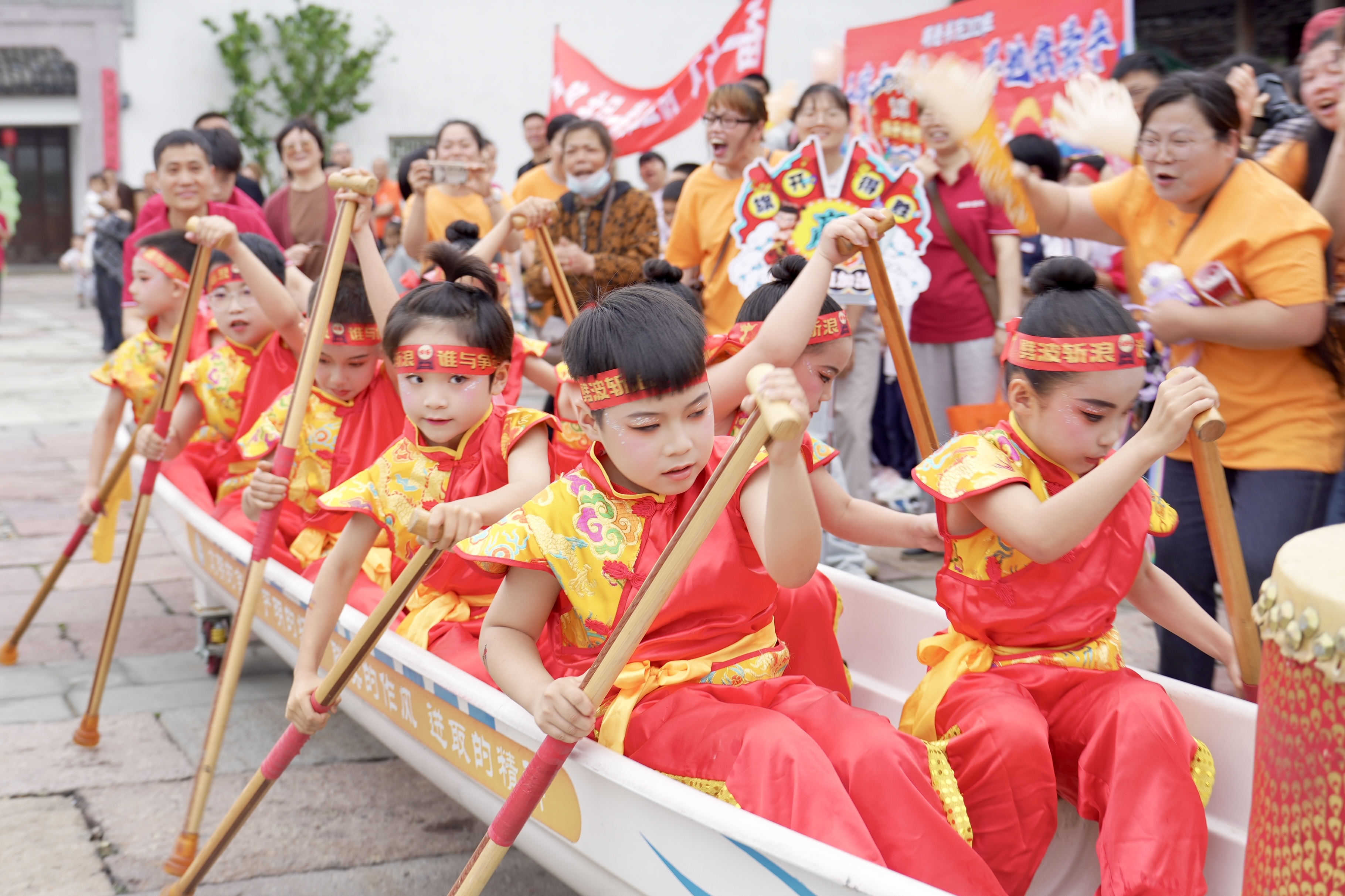 随着一声清脆的锣响,比赛正式拉开帷幕。“一二!一二!”整齐有力的口号声瞬间响彻整个景区。孩子们齐心协力,喊着口号奋力推动 “龙舟” 向前冲。有的队伍配合默契,步伐一致,“龙舟”如离弦之箭般飞速前行;有的队伍起初稍显慌乱,但在队员们的相互鼓励下,迅速调整节奏,奋起直追。现场观众热情高涨,加油声、欢呼声此起彼伏,如同海浪一般一波接着一波。家长们纷纷举起手机,捕捉孩子们比赛的精彩瞬间,想要将这份美好永久留存;小朋友们则兴奋地挥舞着手中的彩旗,为自己支持的队伍呐喊助威,稚嫩的声音中充满了激情。