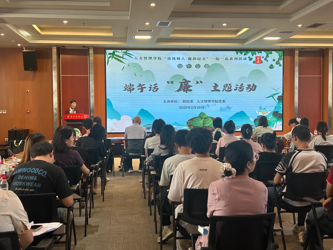 人文管理学院和校纪委联合举办“端午话廉”活动。陕西省农民画协会主席雷新宏、学院教师陈思博士分别围绕农民画中的廉政文化、古典诗词中的廉政思想开展讲座,深入解读廉政文化。讲座结束后,学院开展了香囊 DIY 体验、非遗漆扇制作及廉政书签撰写活动。师生挥毫题写 “公生明・廉生威”等警句,将书法艺术与廉政文化完美融合。