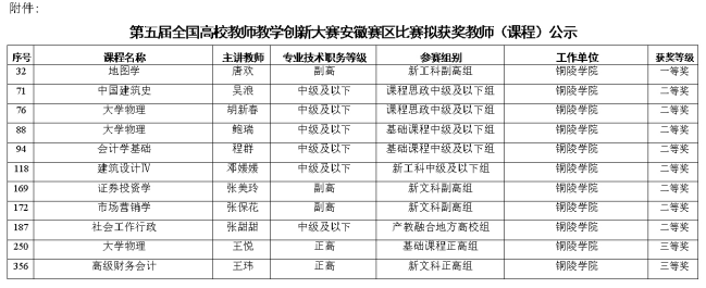 近日,第五届全国高校教师教学创新大赛安徽赛区获奖名单揭晓,铜陵学院教师(团队)荣获一等奖1项、二等奖8项、三等奖2项。本次大赛由安徽省教育厅主办、安徽师范大学承办,全省共51所高校703名教师(团队)参加比赛。
