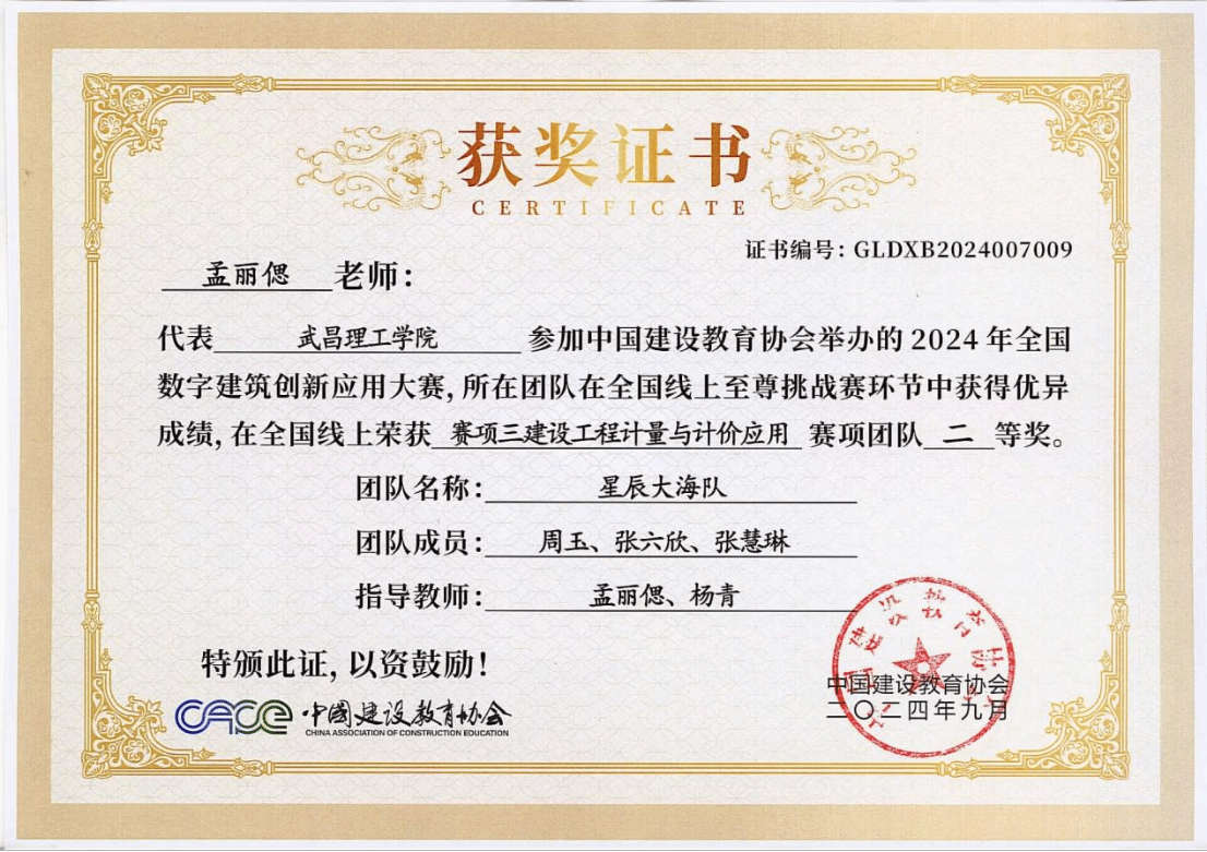 在2024年全国数字建筑创新应用大赛中,武昌理工学院智能建造学院“星辰大海”队凭借扎实的专业功底,灵活运用建设工程计量与计价知识,在“建设工程计量与计价应用”赛项中荣获全国线上团队二等奖。这背后,是课程优秀教师团队的悉心指导。多年来,该学院在全国高校BIM毕业设计创新大赛等赛事中屡获佳绩,2021年更斩获全国数字建筑创新应用大赛团队特等奖,充分验证了“以赛促学、以赛促教”模式的成功,展现了专业实践与创新能力的深度融合。