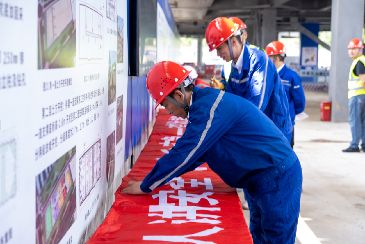 “牢记安全使命,坚守安全底线!”在项目经理姚林带领下,全体人员庄严宣誓,誓词响彻工地,字字凝聚守护生命的决心。随后,参会人员在红色主题横幅上签名,一笔一画烙印责任担当,火红横幅成为现场筑牢安全防线的鲜活见证。