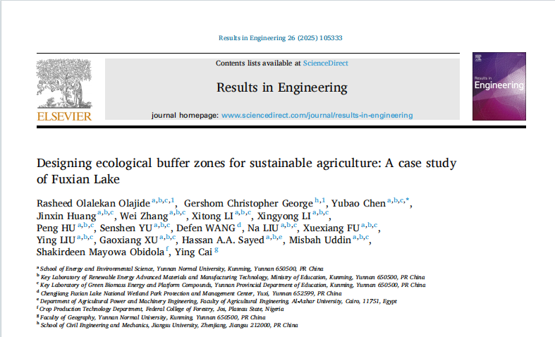 近日,国际期刊Results in Engineering发表了《Designing ecological buffer zones for sustainable agriculture: A case study of Fuxian Lake》研究论文。科技小院入驻尼日利亚籍Rasheed Olalekan Olajide博士后为第一作者,小院首席陈玉保教授为通讯作者,其余作者为入驻小院的专家和研究生。