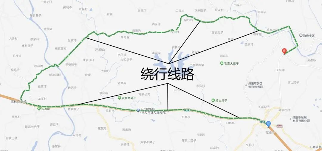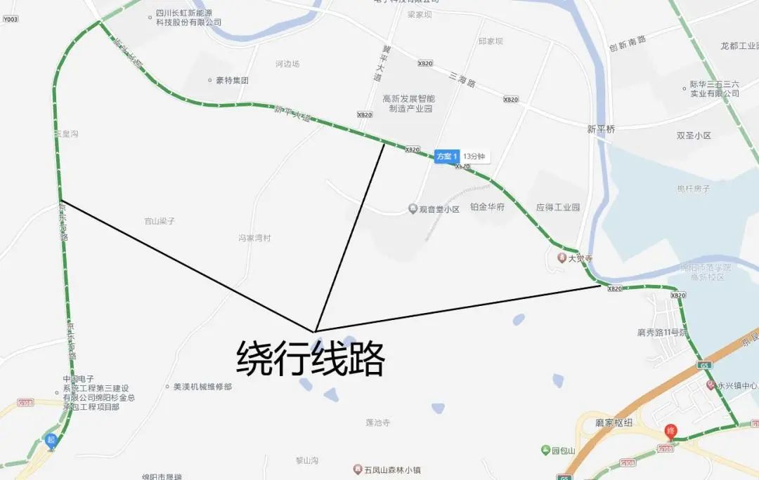 3、关闭绵阳高新区收费站:经绵阳高新收费站上站车辆,经京东方路—新平大道—草溪河南路—绵兴西路—G5绵阳南收费站上站绕行,绕行线路如图:
