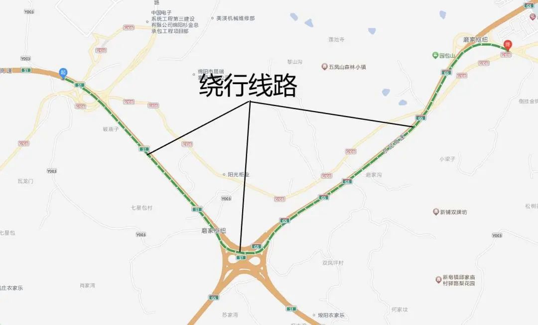 1、封闭成绵向高新区收费站下行匝道:经高新区收费站下站车辆行驶至S1成万高速磨家互通枢纽—G5京昆高速—绵阳南收费站下站绕行,绕行路线如图: