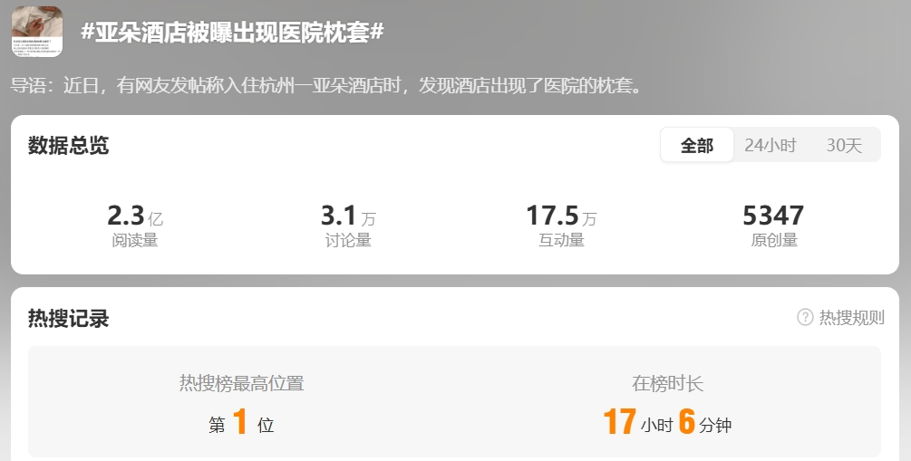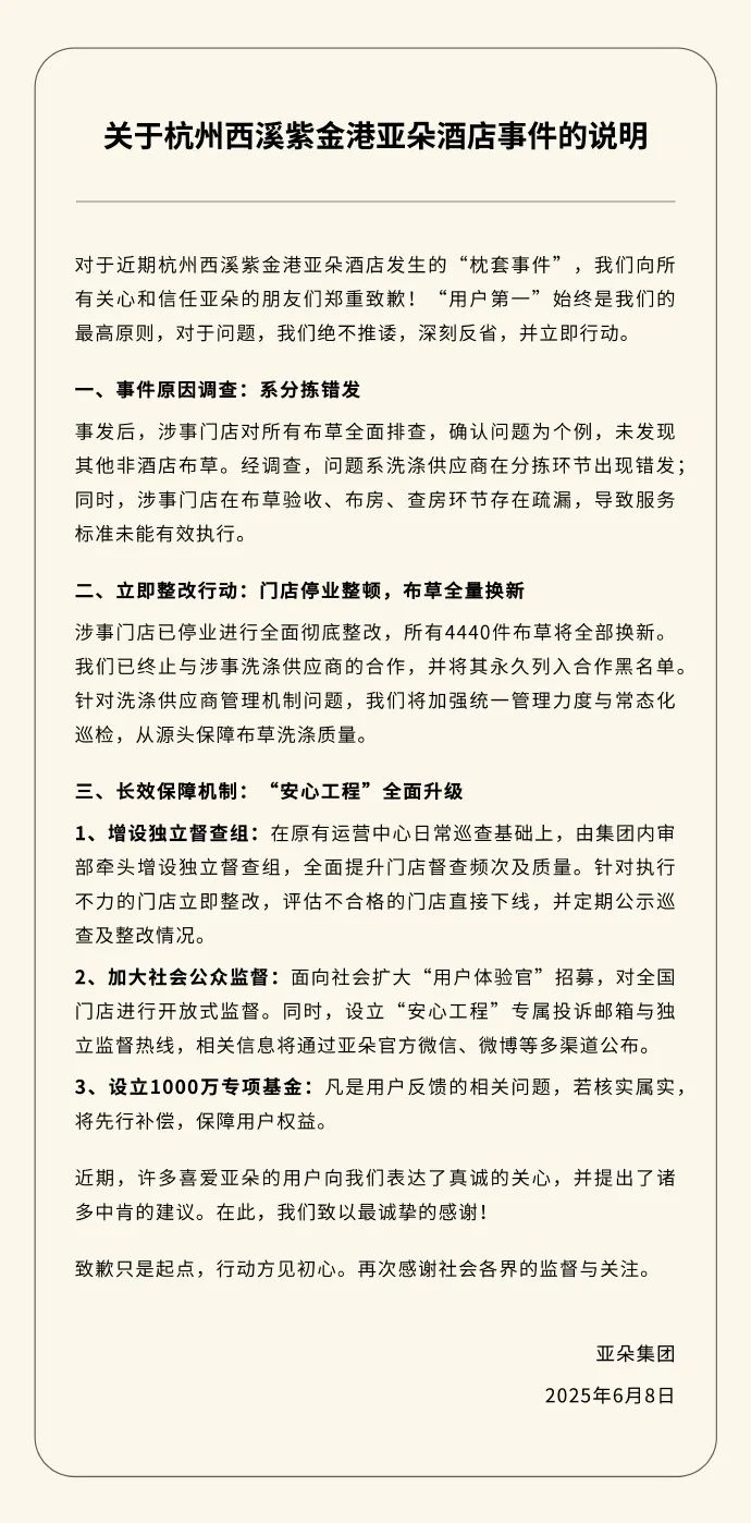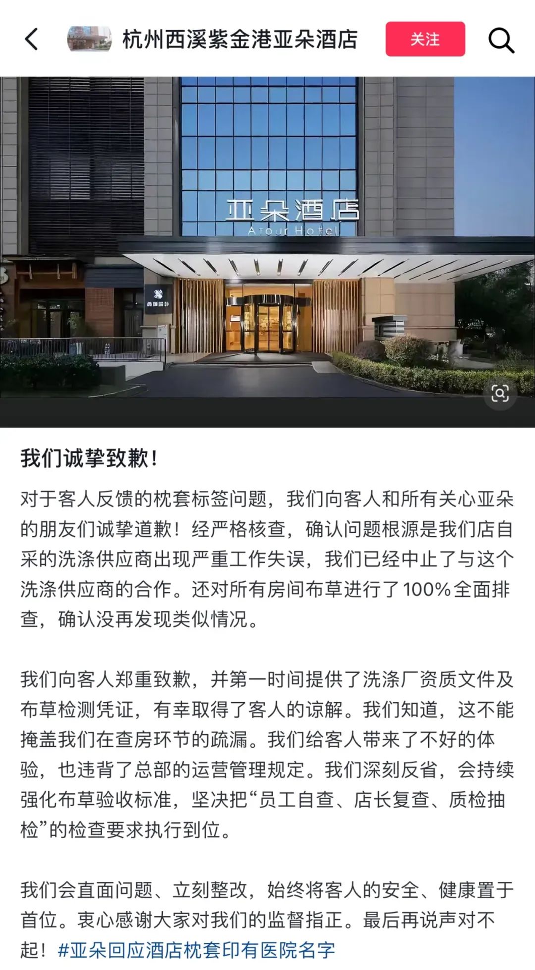 对于近期杭州西溪紫金港亚朵酒店发生的“枕套事件”,我们向所有关心和信任亚朵的朋友们郑重致歉!“用户第一”始终是我们的最高原则,对于问题,我们绝不推诿,深刻反省,并立即行动。