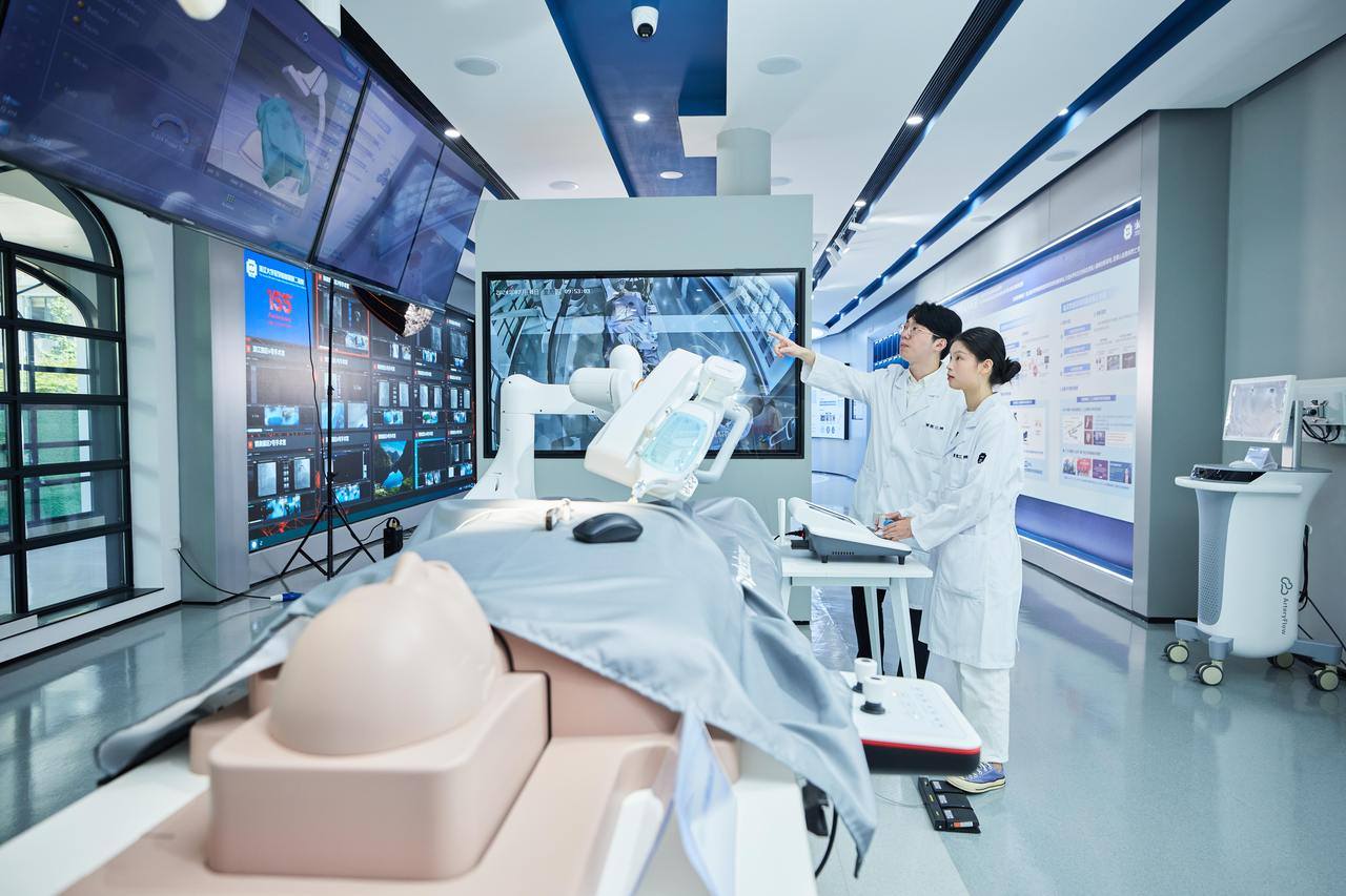 经血管植入器械全国重点实验室展厅内,两名医学生通过手术模拟系统进行操作演练。浙大二院供图