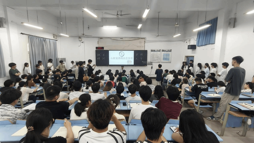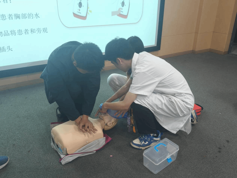 志愿者团队深入各学院开展巡回教学。在智能建造学院,针对工程实践可能出现的创伤情况,重点演示止血包扎与骨折固定技巧;在生命科学学院实验室,结合生物实验安全需求,强化化学品灼伤急救处理教学;面对商学院学生,志愿者以商务活动突发疾病场景为例,详细讲解心肺复苏与AED使用流程。医学协会会长陈宇航通过定制化PPT,结合八大学院专业特色,运用《急危重症护理》《内科护理学》《外科护理学》等知识,对心肺复苏、AED使用、止血包扎、气道异物梗阻解除等急救技能进行分场景理论剖析,并配合标准化操作视频,帮助学生直观掌握要点。