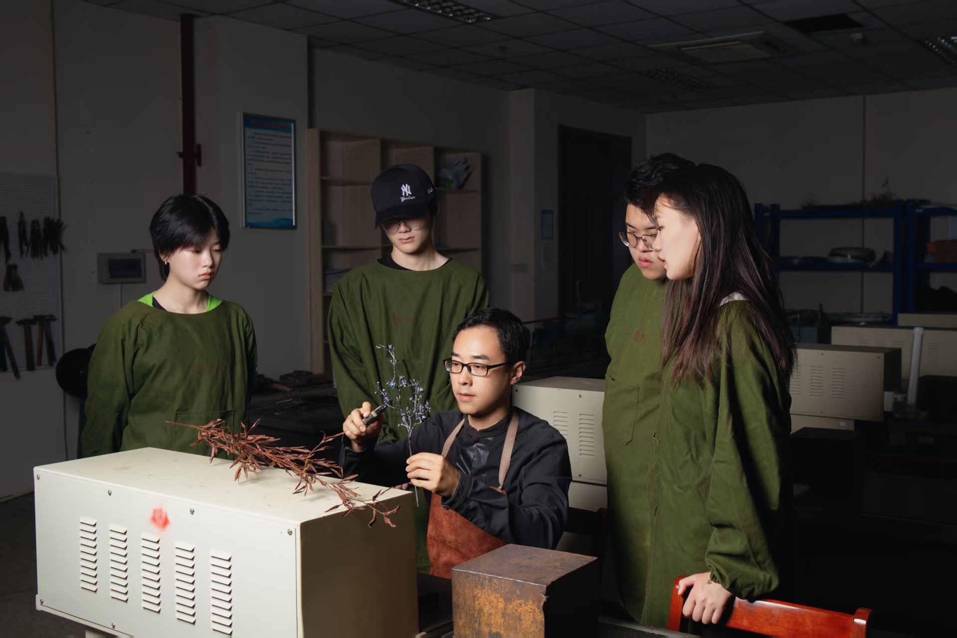 教室里锤声不绝,火星四溅。聂传春手握铁锤,目光如炬,一截素白铁丝在他的铁锤下翻飞跳跃。“一、二、三……七秒!”铁丝在疾速锻打中由冷硬转为灼红,引得学生们惊呼。这是芜湖职业技术学院铁画课堂的一幕,当冰冷的金属在锤击中迸发炽热温度,年轻心灵首次触摸到非遗的脉搏。