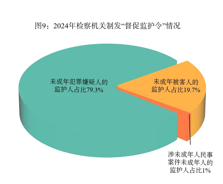 1. 开展“督促监护令”工作情况。2024年,全国检察机关结合办案,针对性督促、引导监护人履行监护职责,共制发“督促监护令”31809份。其中,向未成年犯罪嫌疑人的监护人制发“督促监护令”25235份,向未成年被害人的监护人制发“督促监护令”6280份,向涉未成年人民事案件未成年人的监护人制发“督促监护令”294份。