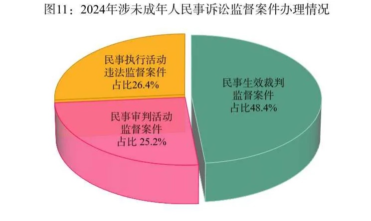 3. 开展民事案件审判监督和执行活动监督情况。2024年,全国检察机关共办理涉未成年人民事诉讼监督案件725件,其中民事生效裁判监督案件351件,民事审判活动监督案件183件,民事执行活动违法监督案件191件。对民事生效裁判提出再审检察建议12件,提出抗诉4件。对民事审判活动违法情形提出检察建议171件,对民事执行活动违法情形提出检察建议162件。