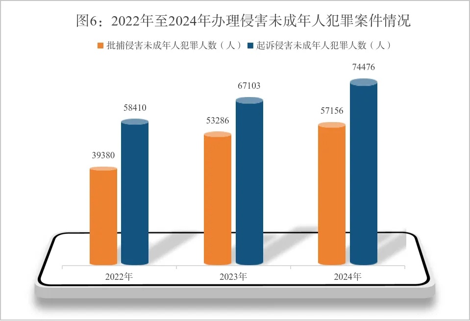 (1)办理侵害未成年人犯罪案件增幅放缓。2024年,全国检察机关共批准逮捕侵害未成年人犯罪57156人,提起公诉74476人,同比分别上升7.3%、11%,增幅较2023年分别下降28个、3.9个百分点。