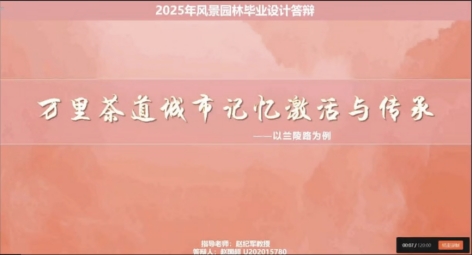第四组汇报由华中农业大学杜雁副教授主持,来自深圳大学、东北农业大学、华中农业大学、山东农业大学的学生代表,依次展示《问潮·答岸——Nbs视角下赤潮治理驱动的红树林文化景观设计》《万里茶道汉口段城市记忆激活与传承策略——以兰陵路为例》《哈尔滨松花江北滨水景观廊道景观规划与设计》《福州海防文化遗产廊道构建与规划设计》《汶水汤汤 商贸往往——汶河古渡两岸商道景观保护与更新设计》等毕设成果。特邀专家王香春、李程成,携手指导老师符兴源、赵彩君、刘钊启,围绕设计理念、技术应用等方面进行专业点评。汇报尾声,山东农业大学赵彩君教授对第三、四组内容总结陈词,为此次联合毕业设计成果汇报会画上圆满句号。
