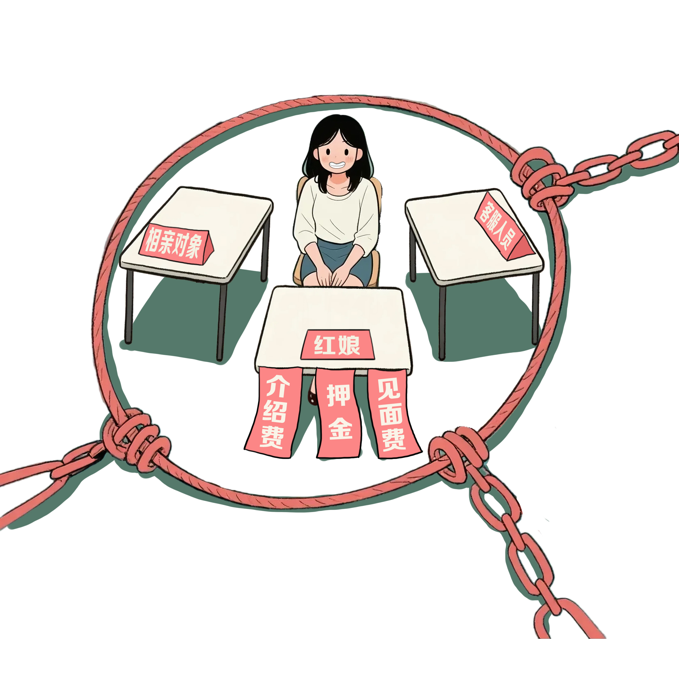 2023年9月起,女子张某(化名)在网上扮起“红娘”,盯上婚恋市场中的单身男女。在社交平台上,张某发布“介绍对象”的广告,吸引有需求的用户添加QQ号。进入私聊后,她“一人分饰多角”:先是扮起了“红娘”,收取介绍费、押金、见面费等,再冒充相亲对象与受害者聊得火热,甚至还伪装成“平台客服人员”继续行骗……