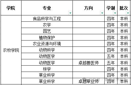 学院现设有动物医学系、动物科学系、农林系和草业科学系4个系,有农学、林学、植物保护、农业资源与环境、园艺、园林、草业科学、动物医学、动物科学、食品科学与工程共10个本科专业,其中有动物医学、农学、草业科学、食品科学与工程、动物科学、林学6个国家级一流本科专业和3个省级一流本科专业建设点。草业科学和动物医学专业入选第一批国家“卓越农林人才培养计划”建设项目。草业科学专业为国家级特色专业,动物医学专业为省级特色专业,动物医学、农学、草学、园艺、动物科学为省级重点学科。设有作物学和草学2个一级学科博士学位授权点,草学、作物学、畜牧学、食品科学与工程、农业资源与环境、兽医学一级学科硕士学位授权点6个,农业、林业、兽医和食品与营养专业学位硕士授权点4个,涵盖农、林、牧、草、食品工程等学科专业领域。