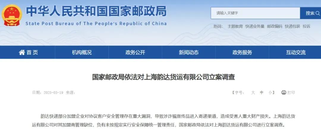 今年3月19日,国家邮政局网站发布消息,韵达快递部分加盟企业对协议客户安全管理存在重大漏洞,导致涉诈骗宣传品进入寄递渠道,造成受害人重大财产损失。