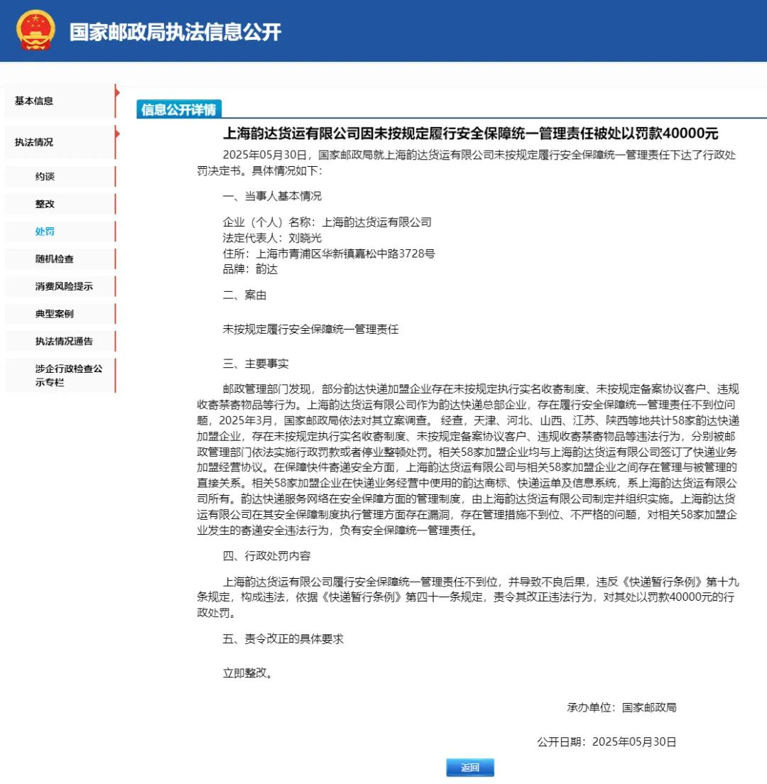 近日,韵达快递关联公司上海韵达货运有限公司,因未按规定履行安全保障统一管理责任,被国家邮政局罚款4万元。