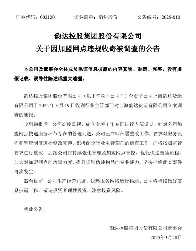 3月20日,韵达股份发布《关于因加盟网点违规收寄被调查的公告》(以下简称《公告》)。全资子公司上海韵达货运有限公司于2025年3月19日收到行业主管部门对上海韵达货运有限公司立案调查的通报。