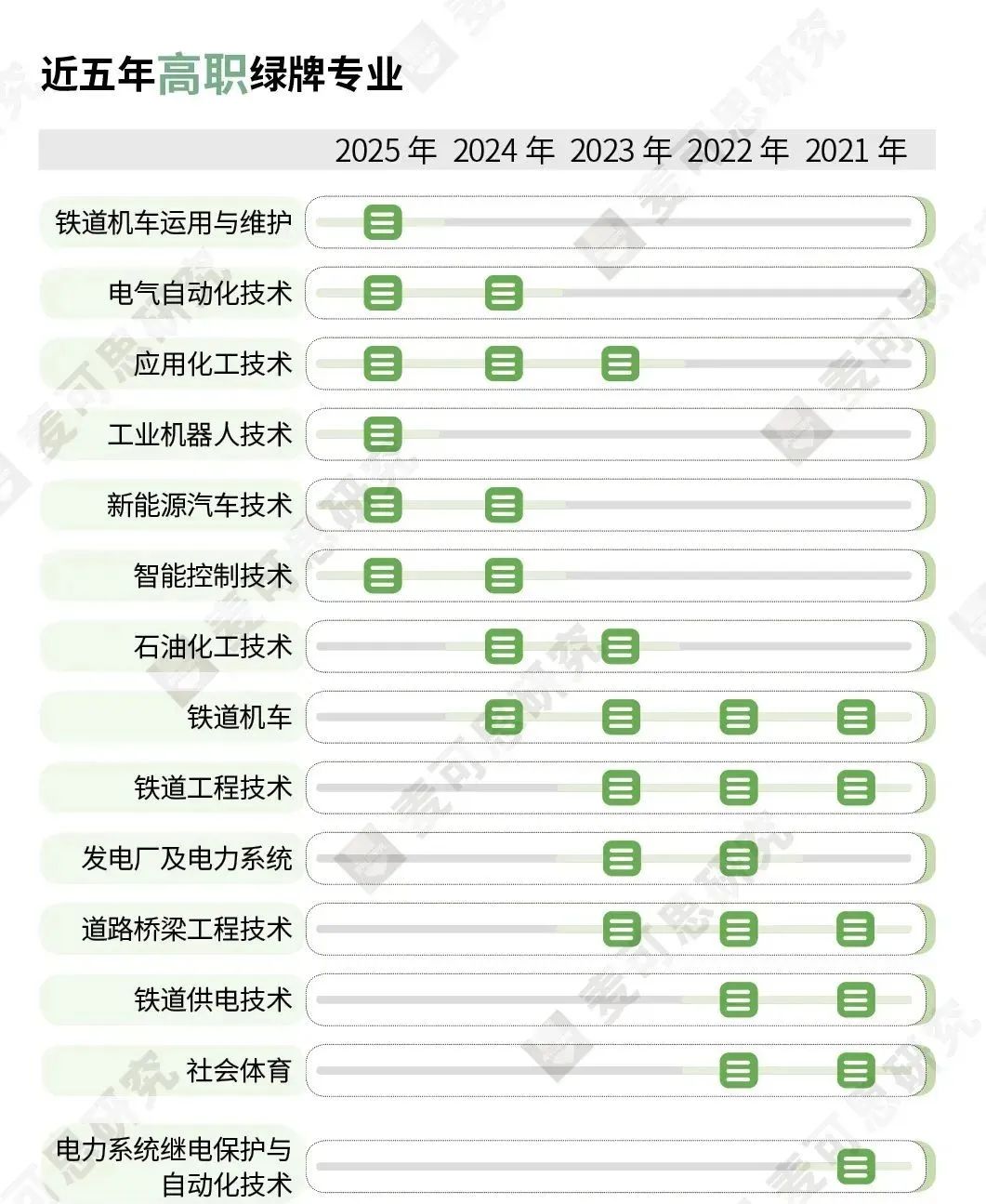 2025年高职绿牌专业包括:铁道机车运用与维护、电气自动化技术、应用化工技术、工业机器人技术、新能源汽车技术、智能控制技术,多为装备制造大类专业。