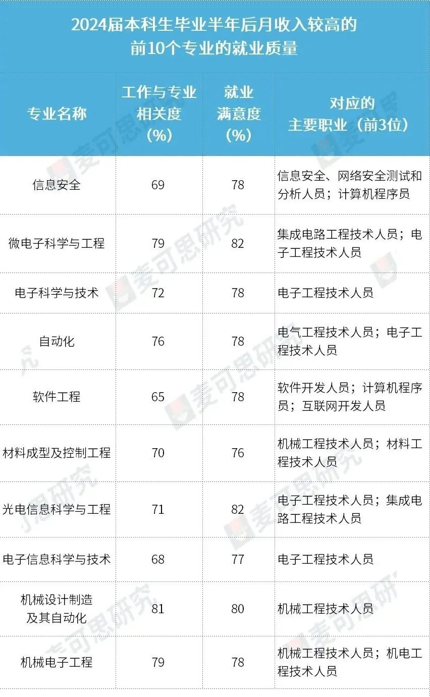 信息安全、微电子科学与工程等专业要求强数理逻辑与工程实践能力。例如,信息安全专业 2024届月收入7599元,位列第一,毕业生主要从事网络安全测试与分析,工作与专业相关度69%,需持续学习应对技术迭代。