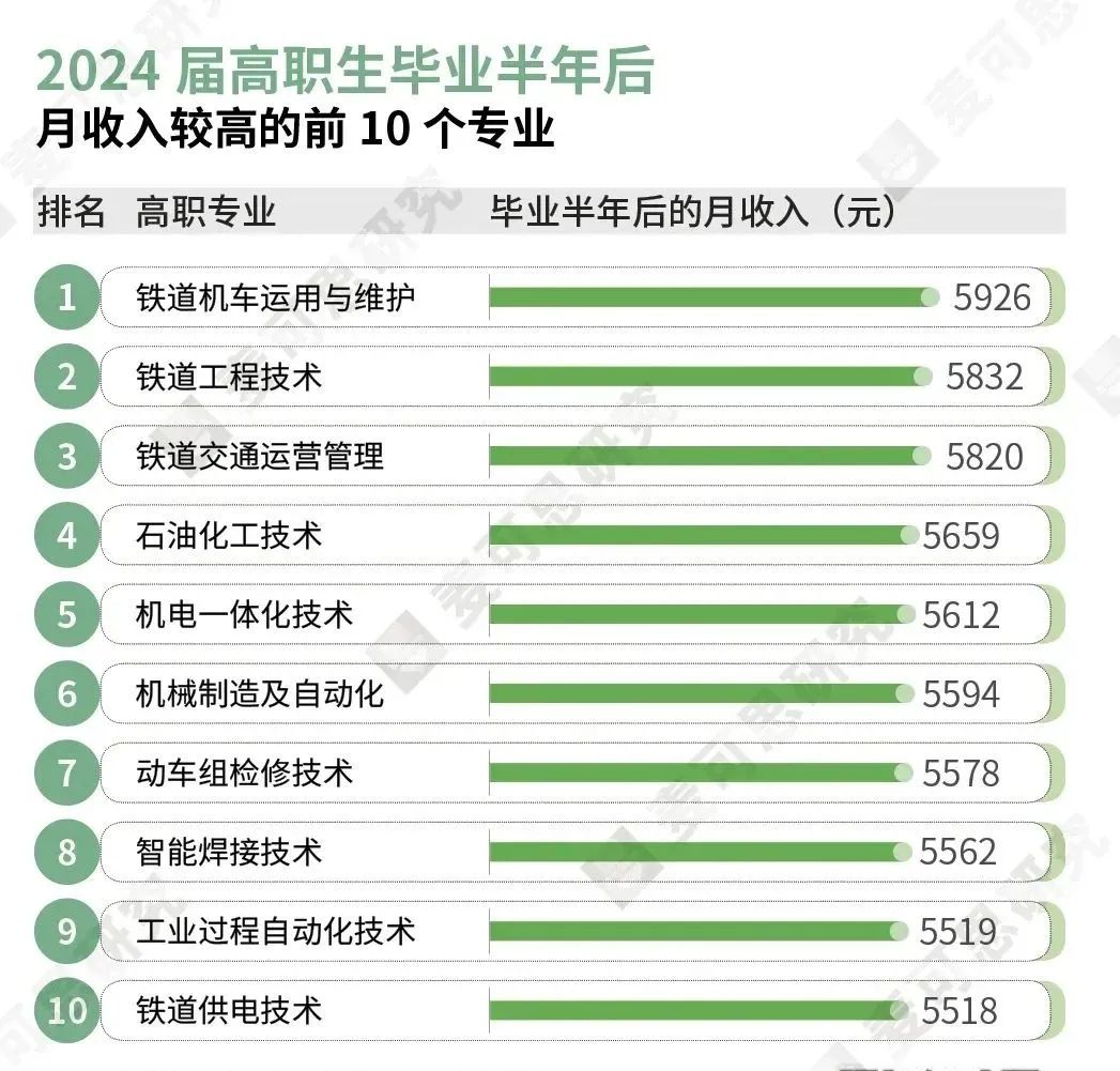2025年的高职绿牌专业均为高职生毕业半年后平均月收入排前30位的专业。其中,2024届铁道机车运用与维护专业的平均月收入为5926元,就业满意度为85%,工作与专业相关度为84%。